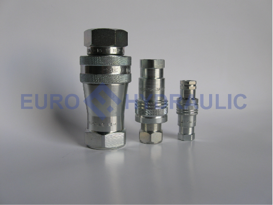 - это классические БРС с клапанами конической формы (встречаются и сферические клапана). БРС ISO. A одна из первых конструкций гидравлических разъемов, широко применяемая в системах с невысокими нагрузками. БРС ISO A устанавливается на сельхозтехнику, прицепные устройства, коммунальные машины и в другой аналогичной технике. Форма клапана снижает сопротивление потоку рабочей жидкости. Соединение полумуфт обеспечивается шариковым затвором. Конструкция затвора допускает взаимное вращение полумуфт БРС в замкнутом состоянии при наличии давления, предохраняя гидравлические рукава РВД от перекручивания. Преимуществом БРС ISO A является невысокая цена, а основной недостаток - наличие открытой полости в полумуфте-розетке, что требует применения пластиковых заглушек.